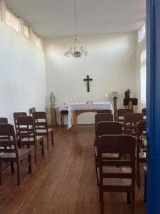 Esta capilla fue construida en los años 50 del siglo pasado para la comunidad de misioneros que vivía y servía en la parroquia, posteriormente se utilizó como velatorio y luego como sala de reuniones. Ahora la hemos rescatado como lugar de culto, para la celebración de la Eucaristía cotidiana.